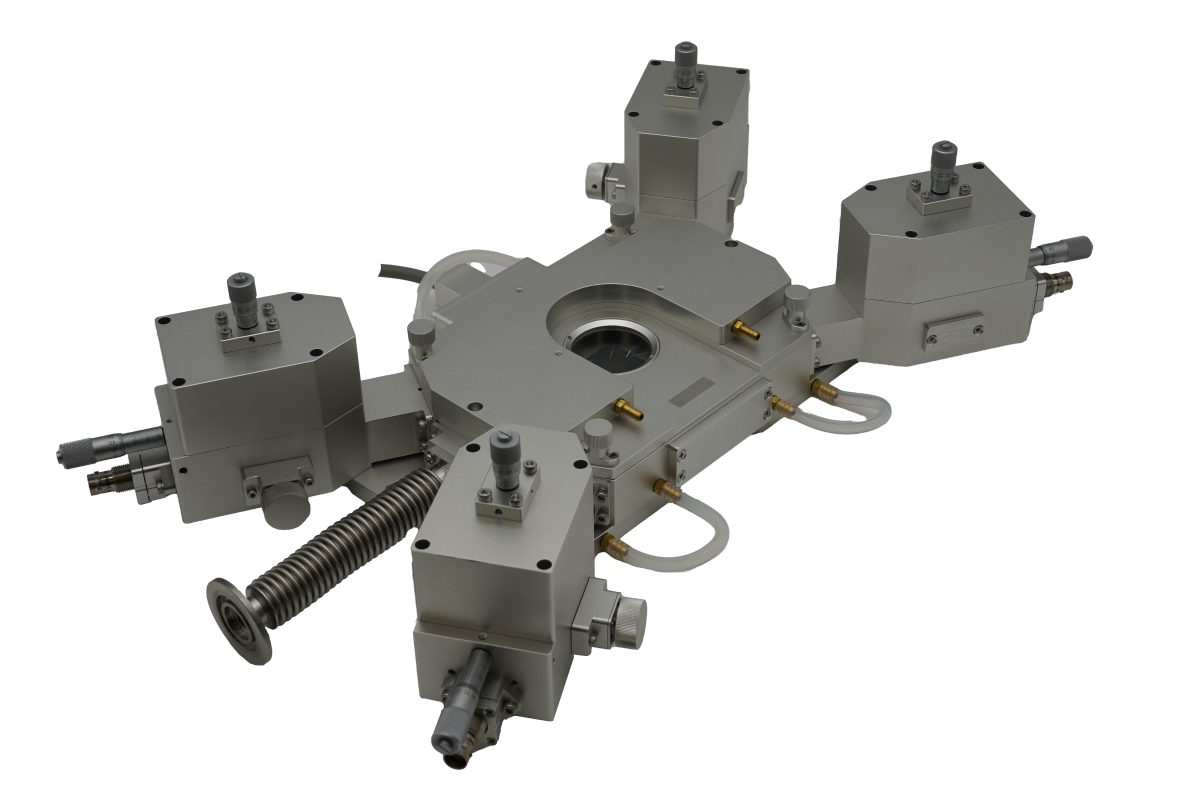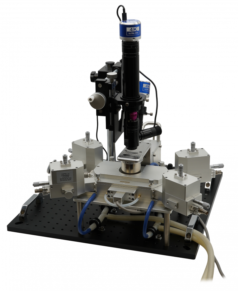 This unique Hall Effect measurment system combines precision temeprature control from rt to 1000°C with a vacuum-tight chamber and external micromanipulated probers to create a powerfull tool for extreme-environment material characterization. Integrated water cooling channels connect to a recirculating chiller to keep the probe station frame cool during operation, even while holding at 1000°C for extended durations.