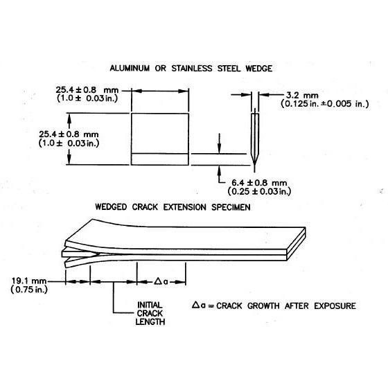 GD3762-99-014 meets the requirements specified in ASTM D3762 for testing the adhesive bonded surface durability of aluminum. The GD3762-99-014 wedges are constructed of 304 stainless steel and machined to the exact standards of ASTM D3742. Reference ASTM Standard D 3762, 2010, D3762 Standard Test Method for Adhesive-Bonded Surface Durability of Aluminum, ASTM International, West Conshohocken, PA, 2010.