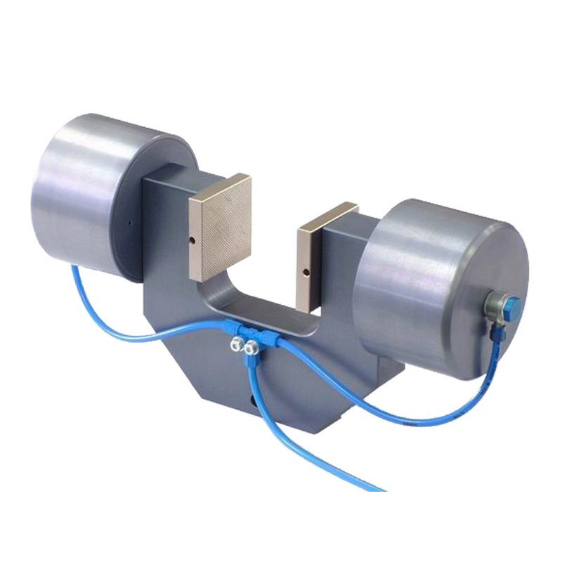 Pneumatic grips, or air grips, use air pressure to provide a simple and efficient method to clamp test specimens. They apply to situations where rapid clamping and quick sample insertion are needed. They also serve test requirements where the material shrinks and a screw action grip loses its grab. Air grips adjust to the changing conditions and hold regardless of sample deformation. Jaws adjust position to handle specimen thickness so force remains centered with the grip body. Multiple interchangeable jaw faces are available in various sizes and surfaces. Most grips can be outfitted with smooth ground, rubber-coated, serrated or diamond cut and wave action.