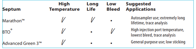 Upper Temperature Limit -Septa BTO, Marathon and Advanced Green 3 can be used at 400°C and higher injector set point temperatures in most instruments. Slight sticking may occur in new injection ports when holding septa above 300°C over periods of many days.