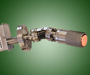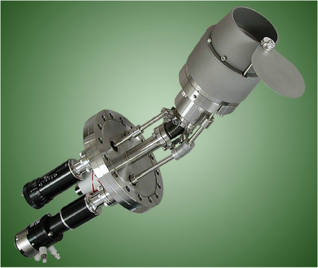Shown above is a typical A320-XP 2" UHV source with in-situ tilt, pneumatic shutter, gas ring, conical chimney and integral gas injection.
