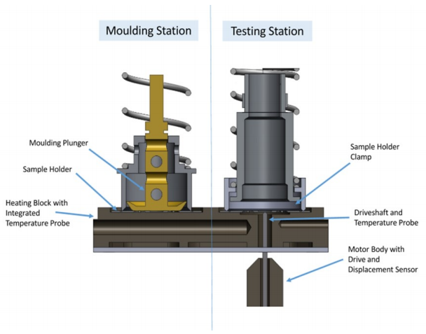 The plastic is then automatically moulded within the machine to produce a highly reproducible test sample for measurement. Being in such close contact with the metal holder also allows high heating rates and ensures that the plastic sample heats rapidly. The operator then transfers the sample to the testing side where it is reheated to measure the thermo-mechanical fingerprint of the material. As the heating block is reheated at 30°/min, the sample area is vibrated by a force motor that contains a temperature sensor at its tip. These signals are used to calculate the stiffness, loss modulus and temperature difference for the sample during the test. These signals constitute the materials thermo-mechanical fingerprint.
