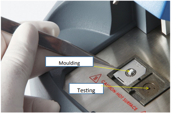 The identiPol QA2 uses a form of thermo-mechanical analysis (TMA) that has a strong relationship to both DMA and DTA, but is neither. It is simply a means of producing a reproducible thermo-mechanical fingerprint of the material being tested. In order to improve reproducibility and sample handling the plastic material (typically a granule or two) is placed onto a patented sample holder and placed into the moulding station within the machine.