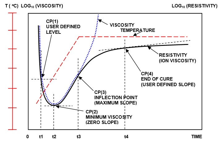 위의 도표는 온도 램프를 사용하여 경화 재료의 ion viscosity와 mechanical viscosity의 관계를 나타냅니다. 처음에 온도가 증가함에 따라 열 경화 재료가 더욱 유동적으로 변하여 resistivity가 감소합니다. 재료가 뜨거워질수록 반응 속도도 증가합니다.
