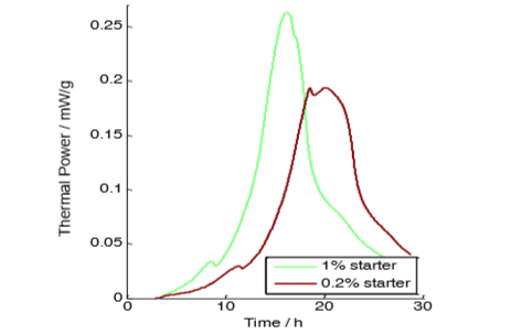 A small amount of starter culture (the fermented product) was added to milk, mixed and loaded into 125 ml sample vials that were placed in the calorimeter. The two samples only differed in the concentration of starter culture that was used (0.2% and 1% by mass of fermented product.