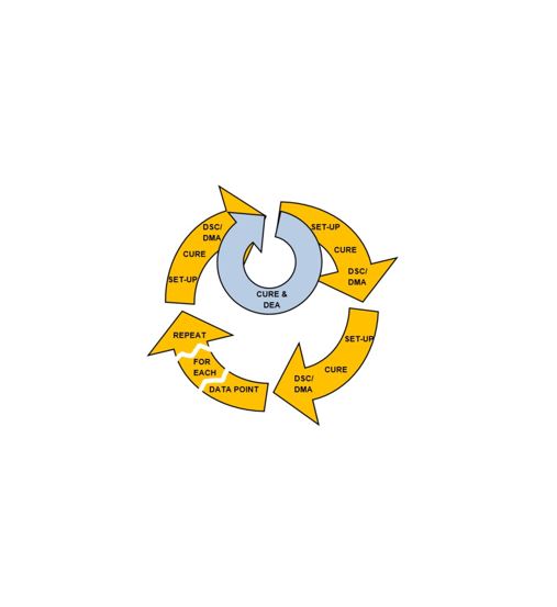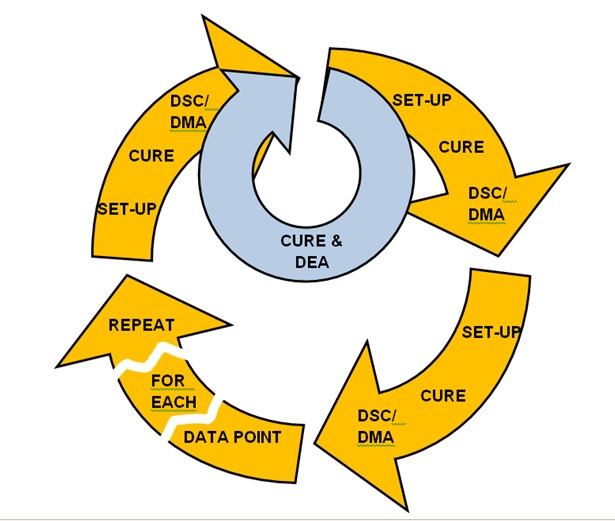 DEA, DSC and DMA measure different material properties. DEA does not replace either DSC or DMA, but instead complements them. In R&D or process development, DEA has the advantage of very simple sample preparation and the ability to make measurements during the entire cure in real time. Dielectric cure monitoring can accelerate R&D by deferring the need to make laborious DSC or DMA tests until near end of development.