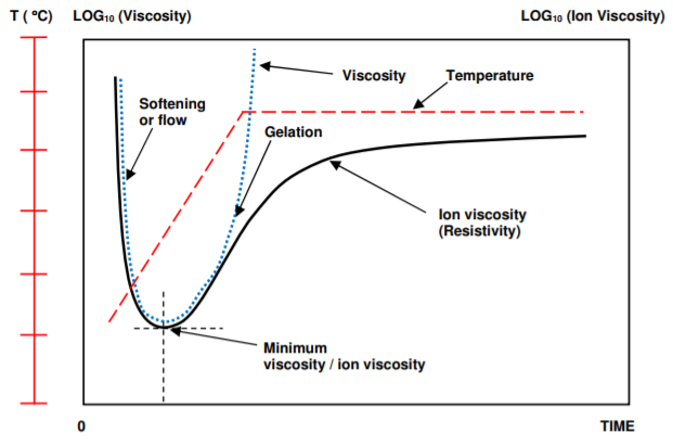 At first as temperature increases, the material softens or melts and mechanical viscosity decreases. Mobile ions also experience less resistance to movement and ion viscosity decreases. At this point the reaction is still slow. As the material becomes hotter, the cure rate increases.