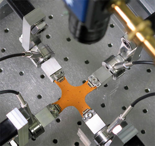 The machines are specially engineered and configured to meet specific customer specimen dimensions and test conditions. Four grips attach the test sample to the machine actuator along each of the flat specimen’s four sides. The machine can be configured with two or four actuators that apply their load to the sample along two primary axes.