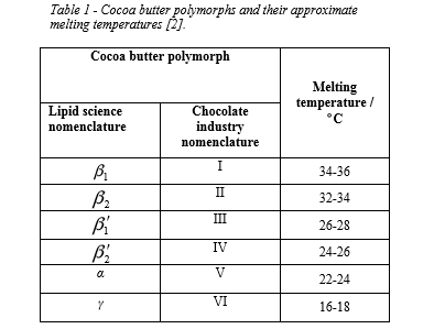 Cocoa butter has a complex crystallization behavior and six identified polymorphs (crystal forms, Table 1). Each of these polymorphs have characteristic melting points and distinct crystal patterns associated with them. To manufacture good quality chocolate, it is essential to induce the formation and stabilization of the β2 polymorph, and this requires controlled crystallization during production. Under-tempered chocolate shows a characteristic 1 β ʹ polymorph and when the crystals transform from 1 β ʹ to 2 β ʹ, a transformation polymorph β1 occurs, which is associated with fat bloom. The metastable γ and α phases and the more stable β ʹphases can crystallize directly from the melt, but the desired β2 form can only be obtained by phase transforming the β ʹ form.