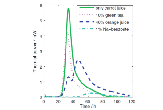 Isothermal calorimetry can directly measure growth curves, which makes it easy and convenient to assess the influence of additives. An example of this is shown in Fig. 6 below, where different additives were tested as possible preservatives of carrot juice.