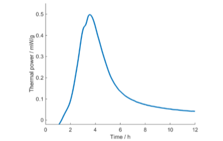 The primary result of such a test is the curve in Fig. 2: the thermal power (heat production rate) as a function of time. The curve in Fig. 3 is the integrated thermal power curve, or the heat, as a function of time. Both these representations can be used in the interpretation of results. The interpretation of isothermal calorimetric growth curves is discussed in more detail by Braissant et al. [1].