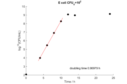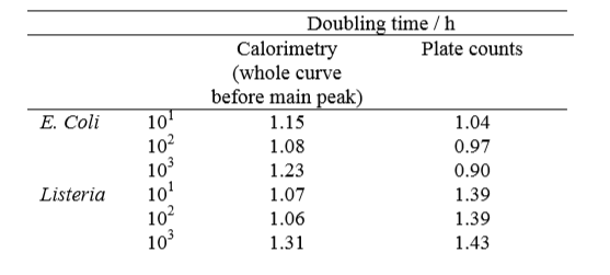 The doubling times were evaluated from both the plate counts and the isothermal calorimetry experiment, and are shown in Table 1 below.