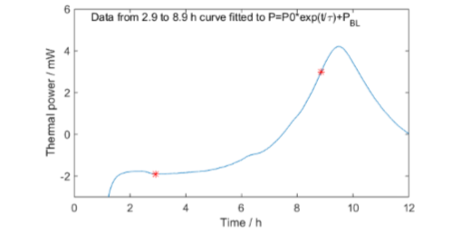 Fig. 8 shows the whole calorimetric measurement. Fig. 9 shows the exponential curve fit for the exponential growth part of the data (between the red stars in Fig. 8). The small peak on the exponential slope was visible in all calorimetric measurements.