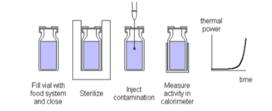 The normal way to do this is to inoculate a food/formulation, while keeping it at a temperature of interest, and taking samples for plate counts at regular time intervals. This is a rather labor intensive measurement as several replicates are needed for every dilution at every time point of analysis. In contrast, with isothermal calorimetry only one sample is needed and the result is directly available (not after the plate count procedure). Inoculation of calorimetric samples can be made as shown in Fig. 4. Note that the sterilization step is optional, depending on the nature of the food system and the objective of the test.