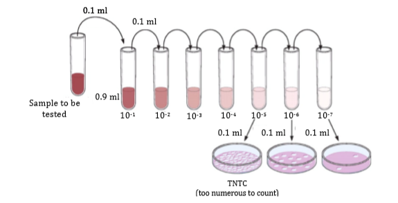 Microbial plate counts is a method to assess the number of viable organisms in a sample by counting the number of organisms that grow (i.e. that form colonies) on a nutritious agar plate. As the number of organisms per unit volume is usually unknown, a series of dilutions are made and plated on separate agar plates. Only the plate on which it is easy to count the number of organisms is used. The number of organisms counted are converted from organisms per unit area to organisms per unit volume, called CFU (colony forming units, typically per ml). The procedure is described in Fig. 1.