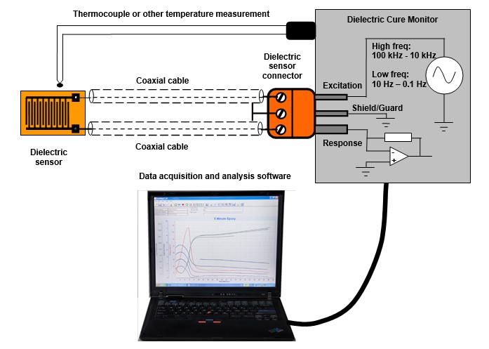 Sensors connect to an instrument, and the most versatile instruments use AC signals for composite cure monitoring. A wide range of excitation frequencies allow selection of an optimal frequency for observing ion viscosity, and multiple frequencies enable studies of the dipolar response. Temperature measurement is important for understanding cure, especially under non-isothermal conditions.