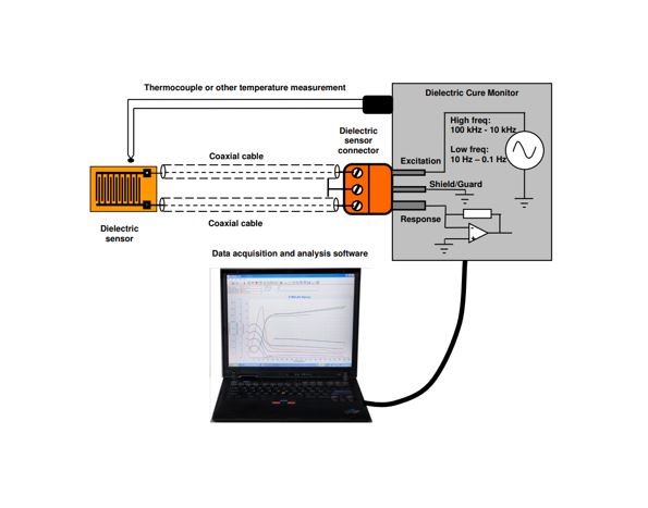 Finally, software controls the instrument, usually through a computer connected to the dielectric cure monitor. Thermoset or composite cure state cannot be determined from a single point measurement, but must be extracted from the change of ion viscosity and the shape of the curve over time. So software, which makes repetitive measurements, and stores and analyzes data, is crucial to the performance of the system.