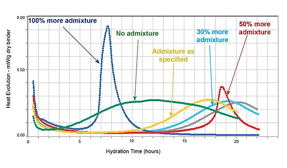 The yellow curve represents a standard mix including a normal dose of a water reducing admixture. A 30% overdose of admixture (light blue) does not show any issues, other than a two-hour retardation. A 50% admixture overdose (red curve) shows both severe retardation and altered shape of the main hydration peak. At 100% admixture overdose (dark blue curve), the steep rise and high peak are indicators of an uncontrolled aluminate reaction, with poor ensuing strength gain.