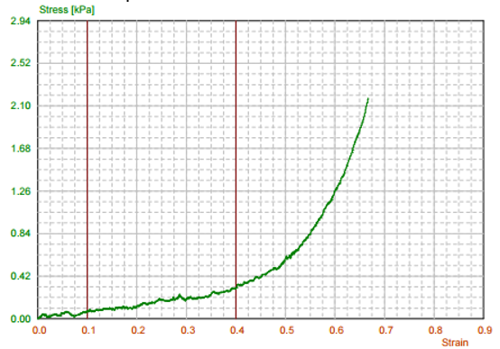 본 시험은 ㈜연진에스텍의 Texture Analyzer (모델 TXA™-Micro-Precision)을 이용해 Compression mode에서 0.1 mm/sec 속도로 hydrogel 샘플을 압축시험하여 Stress/Strain에 의한 Young’s Modulus와 ΔStress/ΔStrain에 의한 Tangential Modulus를 측정 분석하였다.