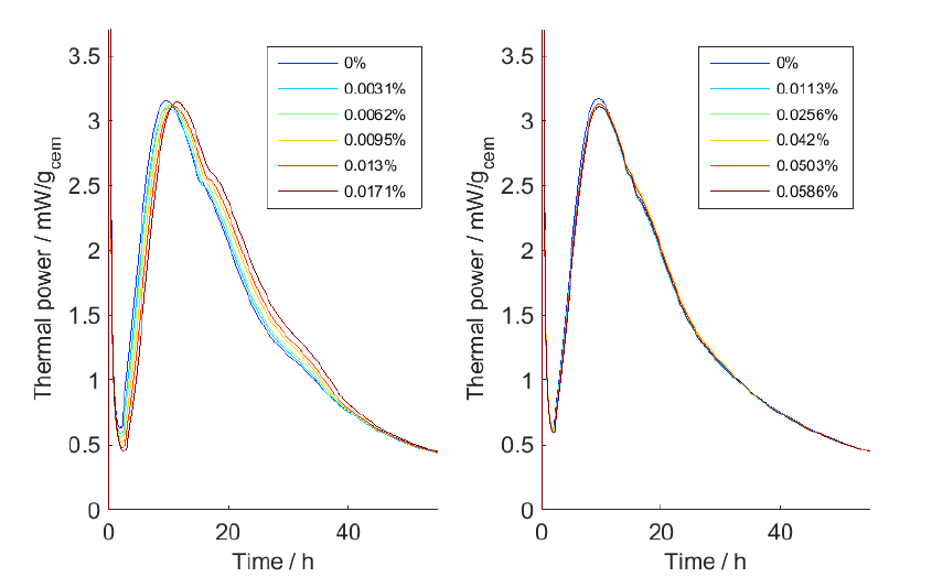 등온 시멘트 열량 측정법의 중요하고 다소 쉬운 작업 중 하나는 응결지연 특성을 정량화하는 것이다. 대부분의 경우 강도를 주는 알라이트 수화 피크 (alite hydration peak)의 onset을 지연시킴으로써 많은 물질이 시멘트 수화의 응결을 지연시키는 것으로 잘 알려져있다.