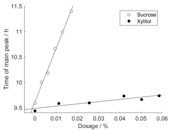 The slopes of the lines in Fig. 2 show how much the hydration peak shifts to the right per mass percent addition of sucrose or xylitol (relative to the mass of cement). The slopes are about 100 and 4 for sucrose and xylitol, quantitatively showing that sucrose is about 25 times more retarding than xylitol.