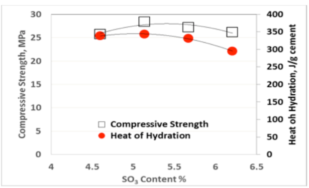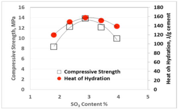 As can be seen from Figures 3-5, there is an excellent correlation between the optimum SO3 content determined using compressive strength and heat of hydration methods, as originally published by Lerch in 1946. Similar results have been obtained for two and three days Heat of Hydration and compressive strength, respectively.