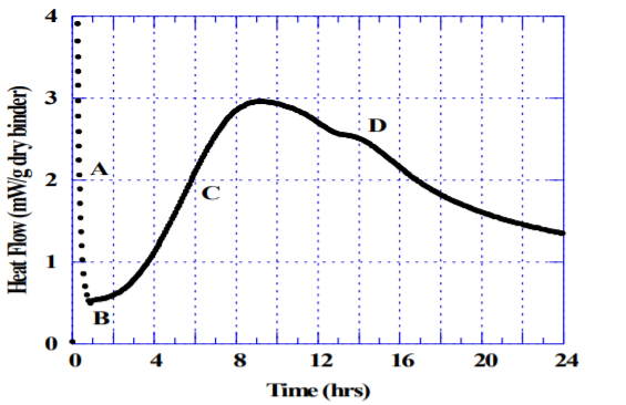 Three different hydraulic cements were tested for optimum SO3 after 24 hours moist curing using compressive strength, as per ASTM C109. Parallel tests for optimum SO3 using heat of hydration were performed using a large cell (125 ml) Calmetrix I-Cal 8000 isothermal calorimeter. The same mortar as used for compressive strength determination was tested for heat of hydration following ASTM C1702 with the following exceptions: i) mortar was used instead of cement paste, ii) the initial exotherm was excluded up until the end of the dormant period, (B) (shown in Figure 2). The broad exotherm (C) denotes the main strength-giving cement hydration peak.