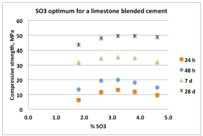 Sulfate is added to Portland Cement to control the early aluminate reaction during cement hydration. Most standards prescribe sulfate optimization at room temperature using standard compressive strength tests to determine which sulfate addition level (expressed as % SO3 by weight of cement) gives the highest compressive strength, usually after 24 hours of moist curing. Figure 1 shows a typical relationship between compressive strength and sulfate addition for a limestone-blended cement at different curing ages. While the optimum SO3 is known to vary with the curing age – it is typically higher at later ages – the value at 24 – 48 h is most widely used in the quality control of cement production.