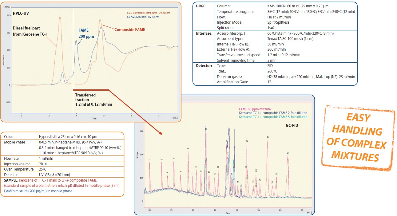 The potential of KONIK K2 HPLC+GC-FID system to determine FAMEs in aviation kerosene samples is presented. The isolation of the diesel fuel (hydrocarbons) from FAME compounds in aviation kerosene is achieved using NPLC-UV system with a Hypersil Si 25 cm x 0.46 mm, 10 pm column and a heptane: MTBE gradient mobile phase. The HPLC+GC-FID system is applied to the analysis of aviation fuel samples to obtain GC chromatograms for the identification of FAMEs >C8 without the presence of interferences of hydrocarbons from matrix. The HPLC+GC-FID system can be also be coupled to KONIK MS Q12 for the unequivocal identification of compounds as a good alternative for the analysis of biodiesel-petrodiesel blends with full automatization of method.