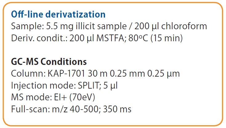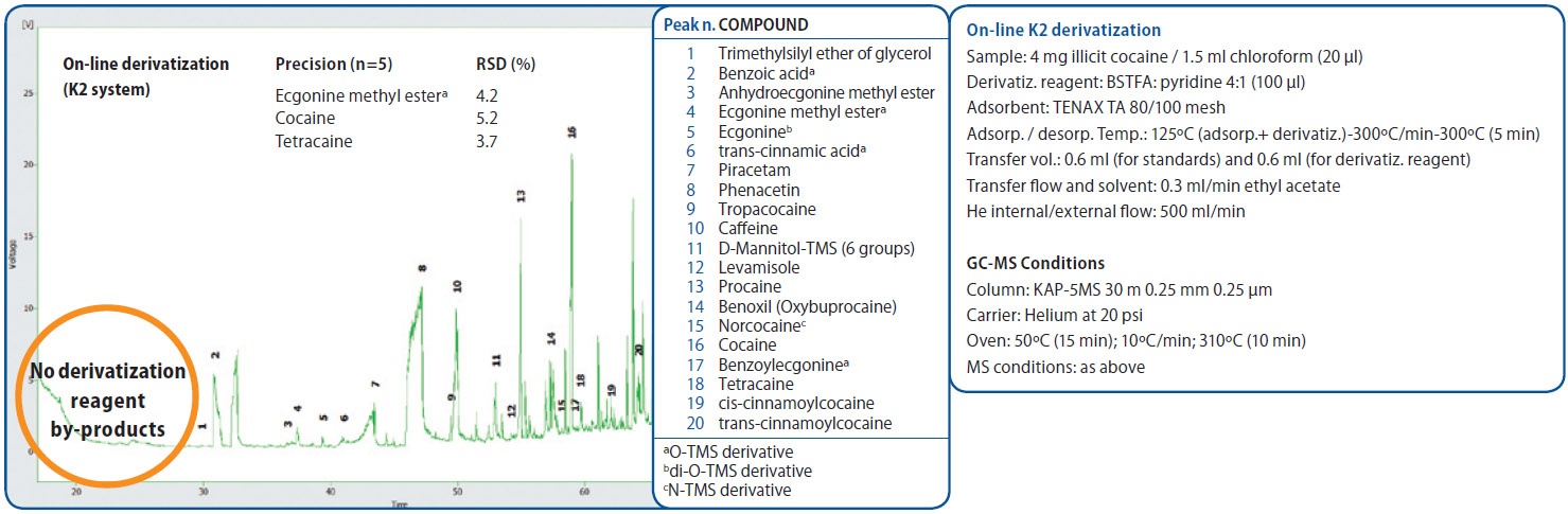 KONIK K2 HPLC+GC-MS system has proved to be suitable for the determination of major and minor components in iNicit cocaine samples. The method allows the automated analysis of polar/non-volatile components by direct derivatization into the interface, avoiding the time-consuming off-line sample derivatization step. The on-line derivatization HPLC+GC method shows high sensitivity, allowing the identification of alkaloids and adulterants in illicit cocaine selectively eliminating derivatization reagent by-products. So, the K2 system allows determining the compounds with less sample consumption and guaranteeing longer column lifetime.