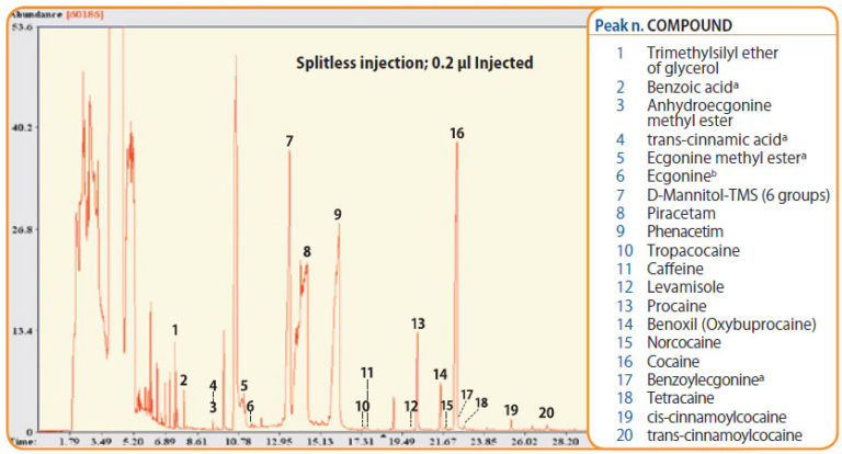 Changing the Split injection mode by Splitless/split allowed the identification of 5 additional alkaloids and cutting agents with pharmacological effects, such as LEVAMISOLE, used as cancer chemotherapy drug.