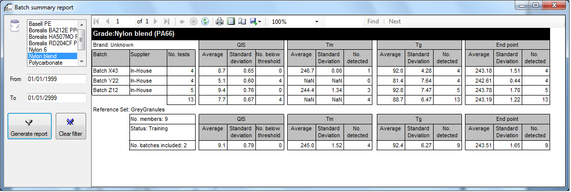 The Batch Summary Report below, details the key properties for each batch. Aside from the Pass / Fail QIS value, the report also includes results for Amorphicity, Melting point, End point and Glass transition temperature. This table can be used as evidence with the supplier to challenge the specifications of Batch Y22 which has a lower glass transition temperature and no measureable melting point.