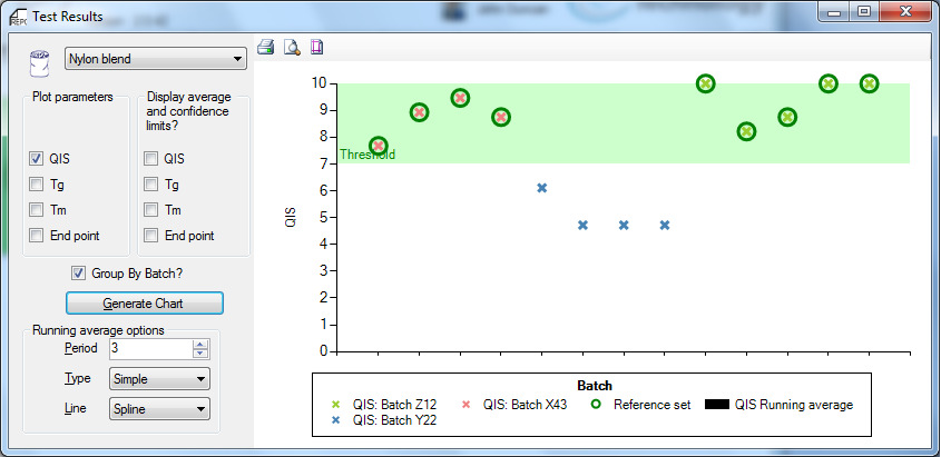 In the example above the QIS value is shown for various batches of Nylon (Z12, Y22 & X43). The green band at the top of the graph is the “Pass Region” and results falling in this zone are acceptable and the material can be processed.