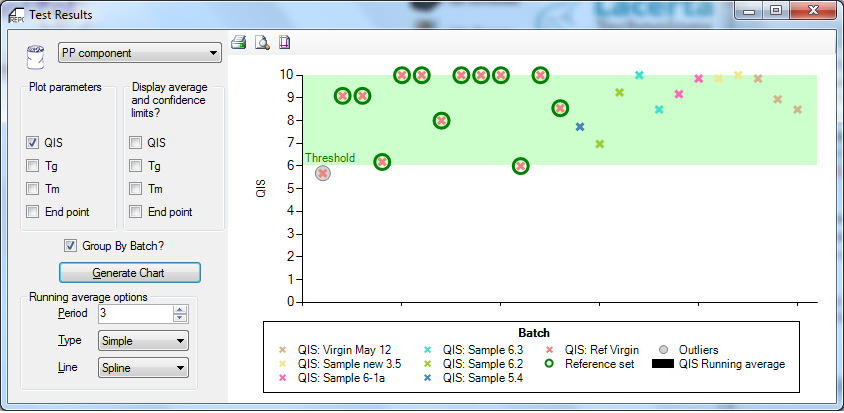 In the example below the QIS value is shown for various samples of a PP component. The consistency of these batches is clear, with average for each batch scoring over 7.