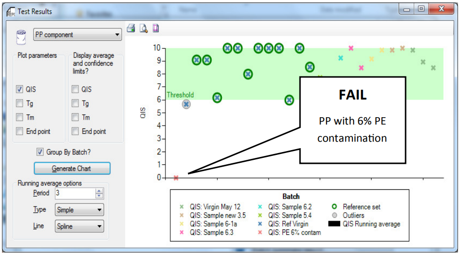 A fresh batch of material, contaminated with only 6% of PE (Polyethylene), was then evaluated using the QA2. The QIS value is seen to drop to zero with only a small amount of contamination, illustrating the sensivity of the QA2 to detecting differences between batches of material.