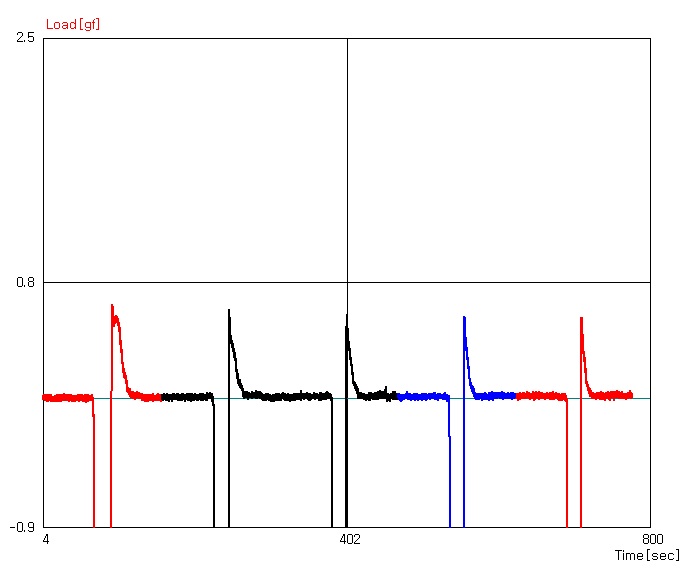 1mm/sec 의 상승속도로 시험한 포스트잇의 tack 시험 결과