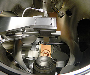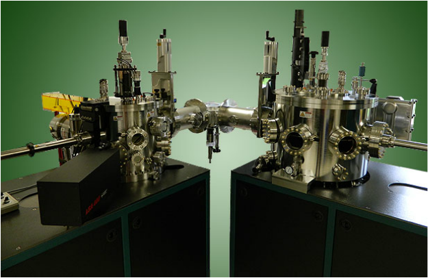 오른쪽 챔버는 풀 버전의 ATC 2200으로써, in-situ tilt가 있는 6 UHV sputter source와 RF 바이어스, Z 모션 및 azimuthal rotation을 지원하는 850°C 기판 히터를 갖추고 있습니다. 왼쪽의 챔버는 safety tunnel을 통한 레이저로 백업되며 6개의 target turret에서 나온 PLD (Pulsed Laser Deposition)가 특징입니다. 이 챔버에는 850°C 가열 및 고압 이중 시차 펌핑 RHEED (double differentially pumped RHEED)도 포함됩니다. 두 챔버는 common vertex 로드 락으로 연결됩니다.