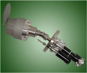 For angled sputtering configurations with rotating substrates, AJA International Inc. sputtering sources can be fitted with the “in-situ tilt” option. This option, shown at the left, allows the source angle to be precisely adjusted from outside the vacuum chamber. Fine tuning the incident angle is critical to achieving good deposition uniformity when working distances, operating pressures and materials are changed. When fixed angle arrangements limit and often compromise the capabilities of a system, “in-situ tilt” can deliver better than ± 2% uniformity on substrates which can be up to triple the diameter of the source targets.