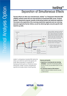 IsoStep™ is a temperature-modulated DSC method that allows you to determine specific heat capacity and kinetic effects separately in a single DSC run. Overlapping thermal events can therefore be clearly distinguished. IsoStep™ provides a straightforward approach to the determination of heat capacities.