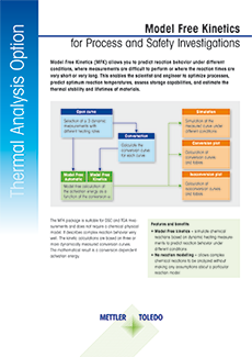 Model Free Kinetics (MFK) allows you to predict reaction behavior under different conditions, where measurements are difficult to perform or where the reaction times are very short or very long. This enables the scientist and engineer to optimize processes, predict optimum reaction temperatures, assess storage capabilities, and estimate the thermal stability and lifetimes of materials.