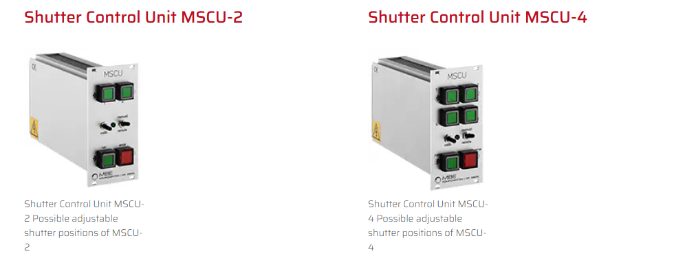 There are two variants: MSCU-2 and MSCU-4. The MSCU-2 is used for shutter positioning in Dual Cluster Sources DCS while the MSCU-4 ist used for shutter positioning in Quad Cluster Sources QCS.