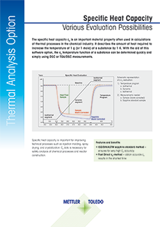 The specific heat capacity cp is an important material property often used in calculations of thermal processes in the chemical industry. It describes the amount of heat required to increase the temperature of 1 g (or 1 mole) of a substance by 1 K. With the aid of this software option, the cp temperature function of a substance can be determined quickly and simply using DSC or TGA/DSC measurements.