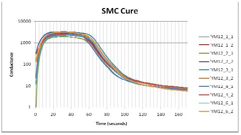 For a single batch of liquid resin, good mixing can produce a homogeneous free ion concentration, and the measured conductance can be uniform from sample to sample. In contrast, a material like SMC has a high content of non-conductive chopped glass fibers mixed with polyester, vinyl ester or epoxy resin. This composite is semi-solid, is difficult to mix well, and as a result different samples may have different ratios of fiber to resin. The measured conductance of SMC is therefore likely to vary among samples from a single batch, as illustrated in Figure 5-3.