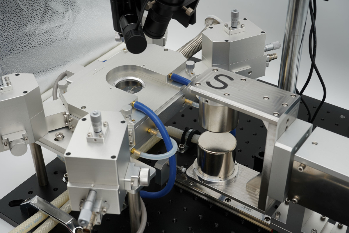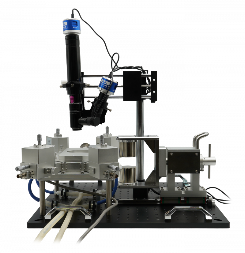 This unique Hall Effect measurment system combines precision temeprature control from rt to 1000°C with a vacuum-tight chamber and external micromanipulated probers to create a powerfull tool for extreme-environment material characterization. Integrated water cooling channels connect to a recirculating chiller to keep the probe station frame cool during operation, even while holding at 1000°C for extended durations.