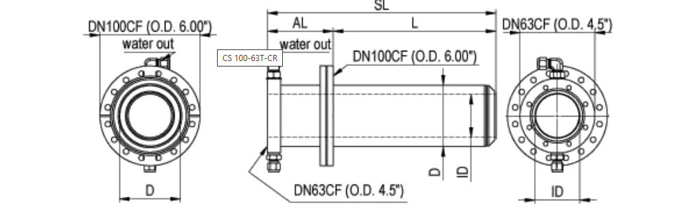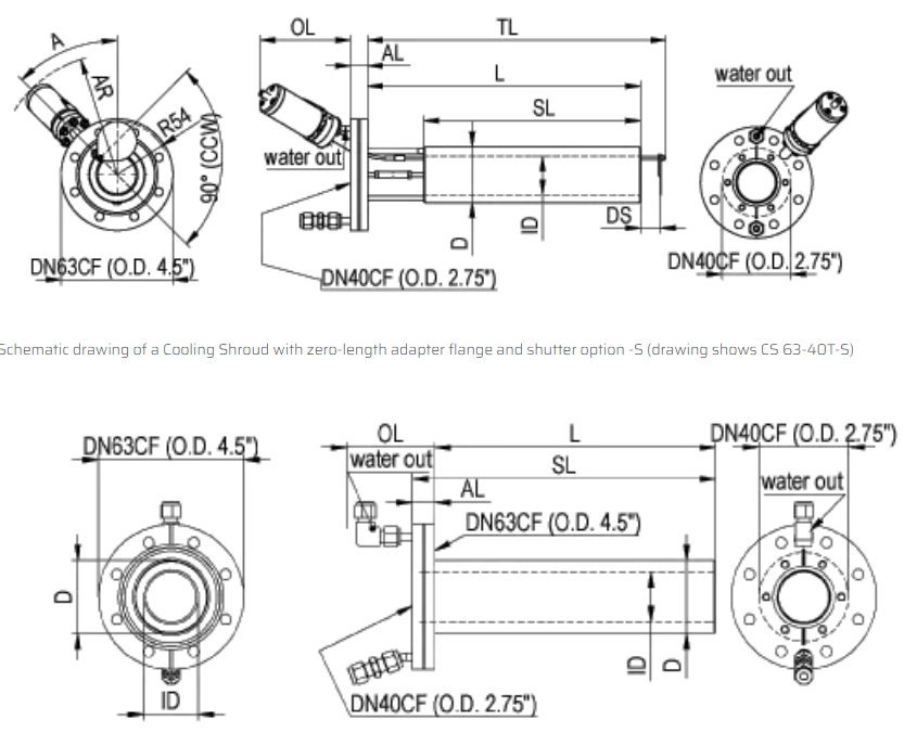 Schematic drawing of a closed Cooling Shround with retracted DN63CF (O.D 4.5" source flange (drawing shows CS 100-63T-CR)