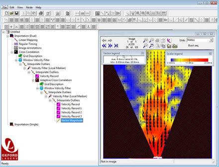VidPiIV is a visual programming language for particle image velocimetry combining complete analysis control, next-generation algorithms (including Ultra PIV resolution) and ease of use. Oxford Lasers offers basic particle image velocimetry software that can be upgraded to include Ultra and 3D PIV analysis. The software works equally well with standard systems as well as high speed systems.