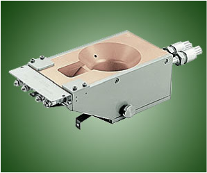 On the the same side of the block (below these primary field lines) is a filament which produces electrons by thermionic emission and is formed into a beam - this is called the emitter assembly. This electron beam is "steered" by these field lines in a 270o arc to impinge on the center of the pocket. The electron beam's energy is controlled such that the magnetic field will bend it precisely into the center of the pocket.