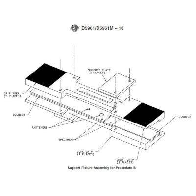 The GD5961-B fixture meets the requirements of ASTM D5961 for testing the bearing response of fiber-reinforced polymer-matrix composite laminates, using procedure B. Testing procedure B requires a specimen composed of two halves joined by one or two centerline fasteners. GD5961-B is a support fixture for use with the stabilized configuration described by ASTM D5961 and can be utilized for both tension and compression loading. Reference ASTM Standard D 5961, 2010, Standard Test Method for Bearing Response of Polymer Matrix Composite Laminates, ASTM International, West Conshohocken, PA, 2010.