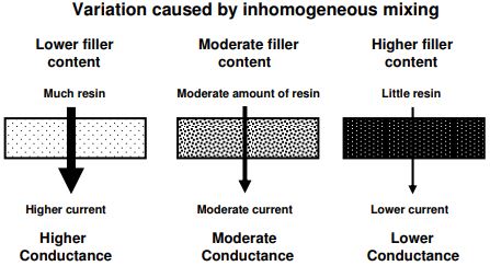 For a single batch of liquid resin, good mixing can produce a homogeneous free ion concentration, and the measured conductance can be uniform from sample to sample. In contrast, a material like SMC has a high content of non-conductive chopped glass fibers mixed with polyester, vinyl ester or epoxy resin. This composite is semi-solid, is difficult to mix well, and as a result different samples may have different ratios of fiber to resin. The measured conductance of SMC is therefore likely to vary among samples from a single batch, as illustrated in Figure 5-3.