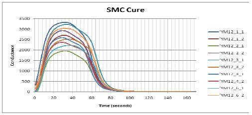 Figure 5-1 shows how conductance varied during cures of several samples from the same batch of sheet molding compound (SMC). The data are plotted against a linear scale and reveal considerable sample to sample variation, with a 140% difference between the maximum and minimum values of peak conductance. At first glance the lack of consistency casts doubt about the usefulness of dielectric cure monitoring; however, to avoid misinterpretation, it is necessary to understand the factors that determine conductance.